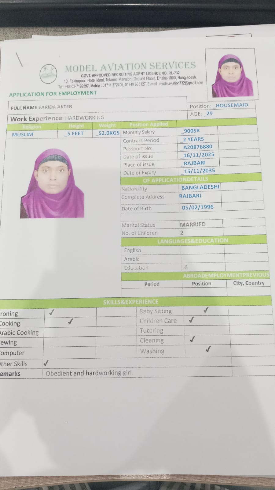 اسم العامل : FARIDA AKTER