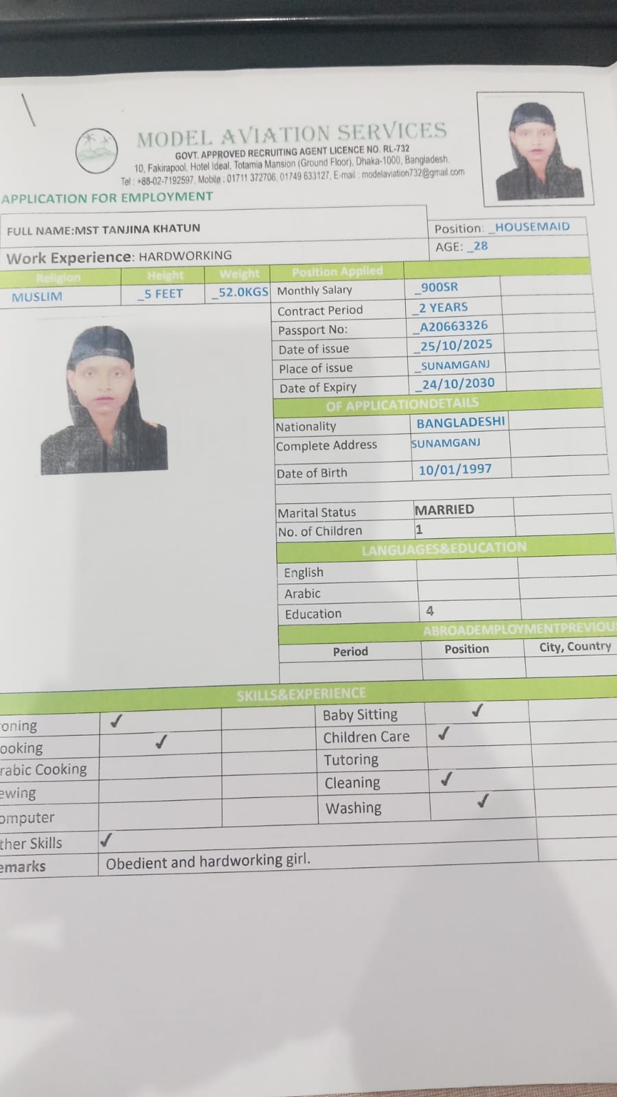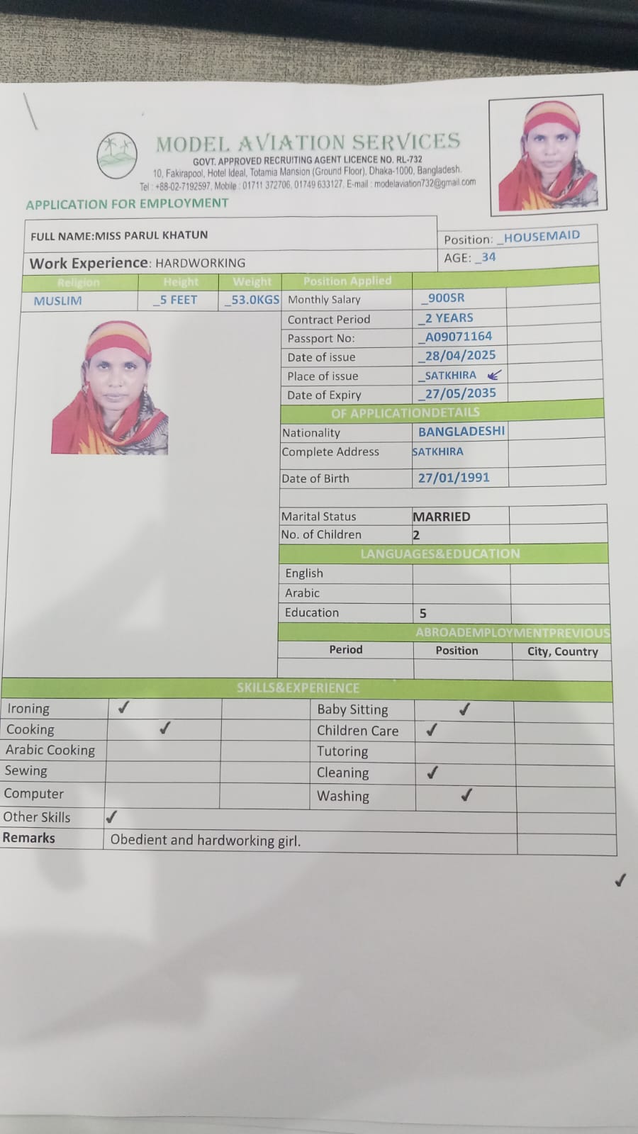 اسم العامل : JABADA AKTER
