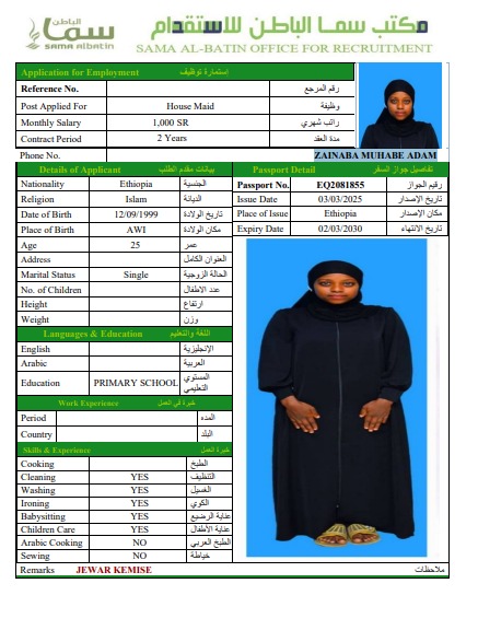 اسم العامل : ZAINABA MUHABE ADAM